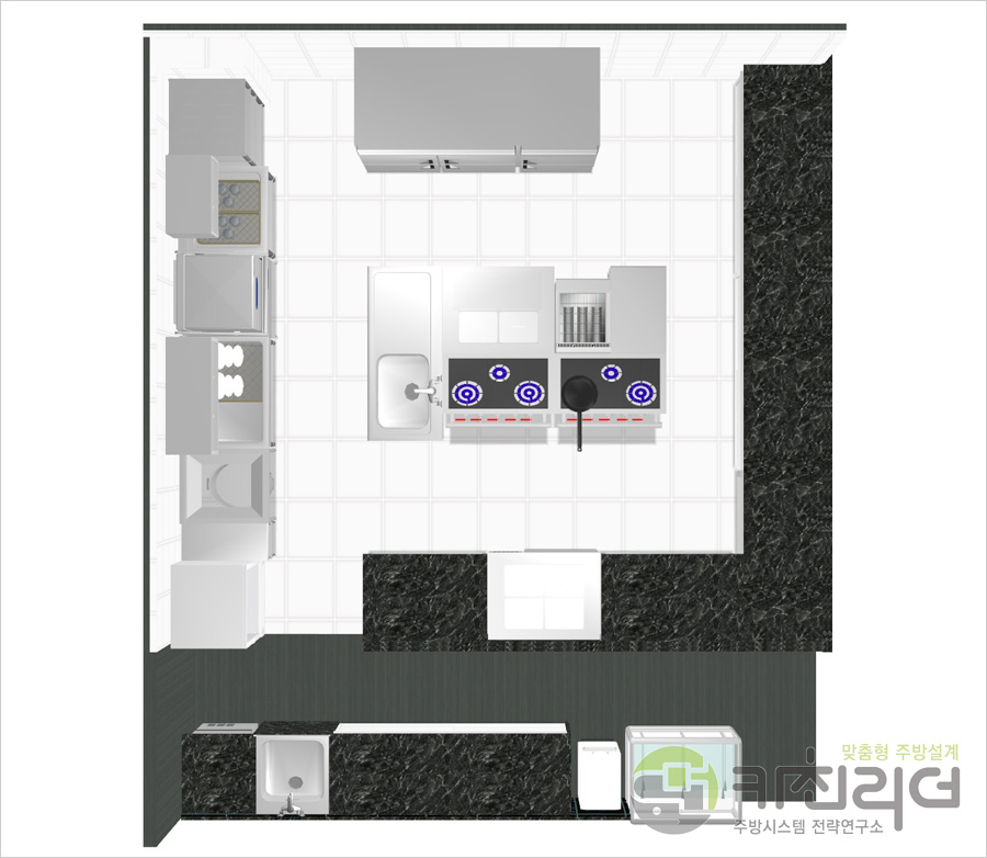 중앙에 조리공간을 배치 하여 각 사이드 공간을 작업공간으로 확보한 모습 입니다.