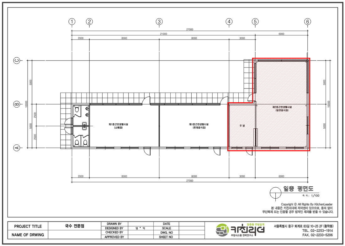 건물 평면도에 빨강색 표시된 부분이 식당 예정위치 로서 고객님 깨서 보내주신 자료를 참고하여